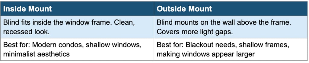 Condos & High-Rises: Shallow frames are common — consider an outside mount. Floor-to-ceiling windows may benefit from motorized blinds for convenience.