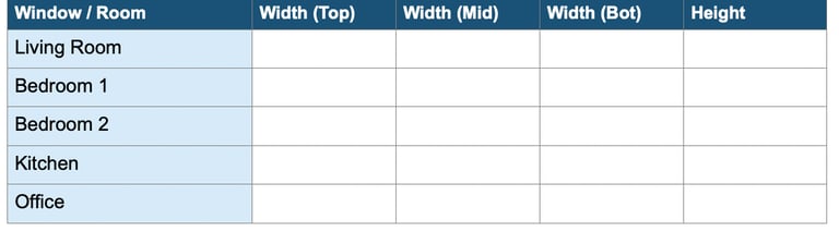 Use this simple table to record measurements for each window before placing your order: